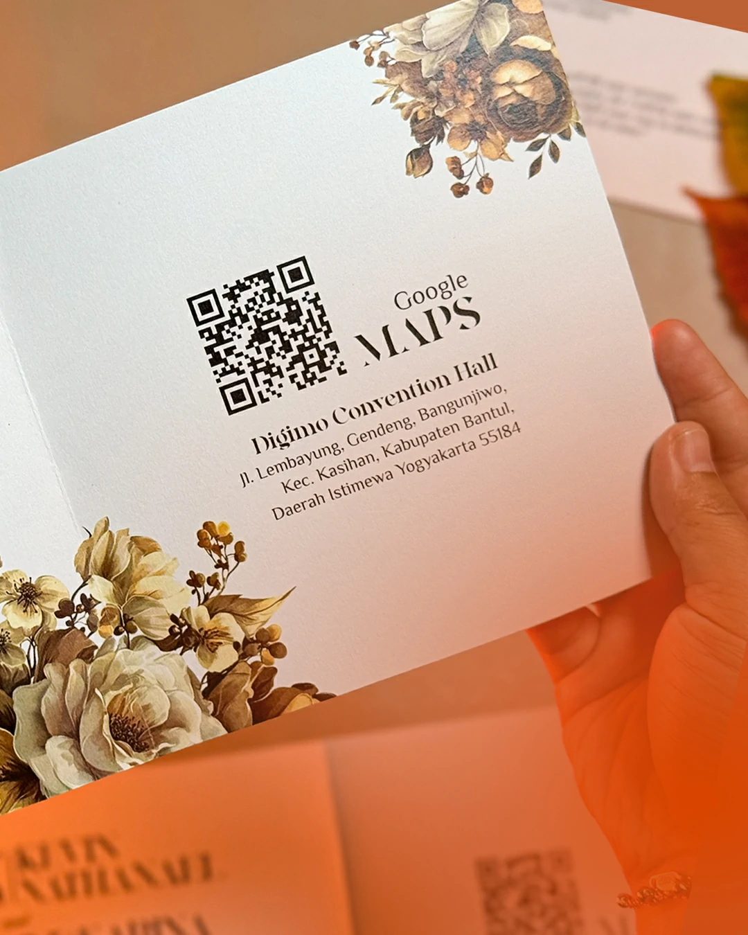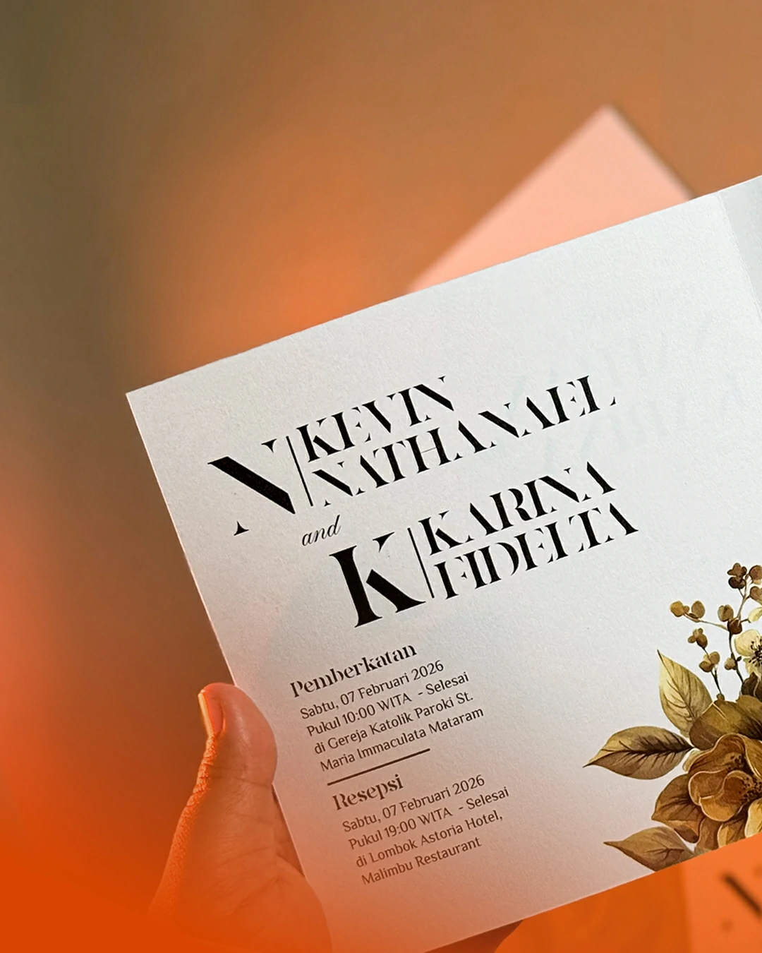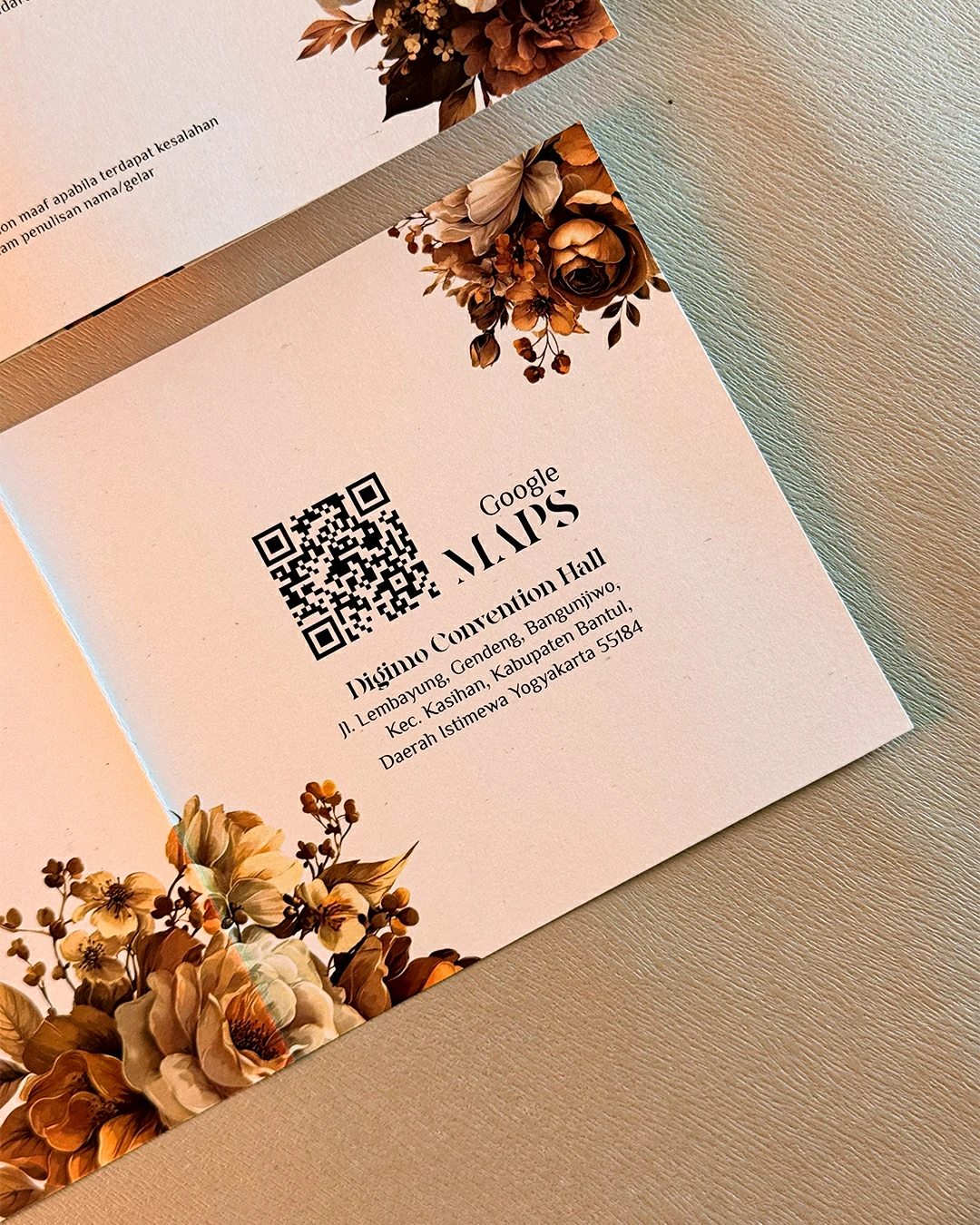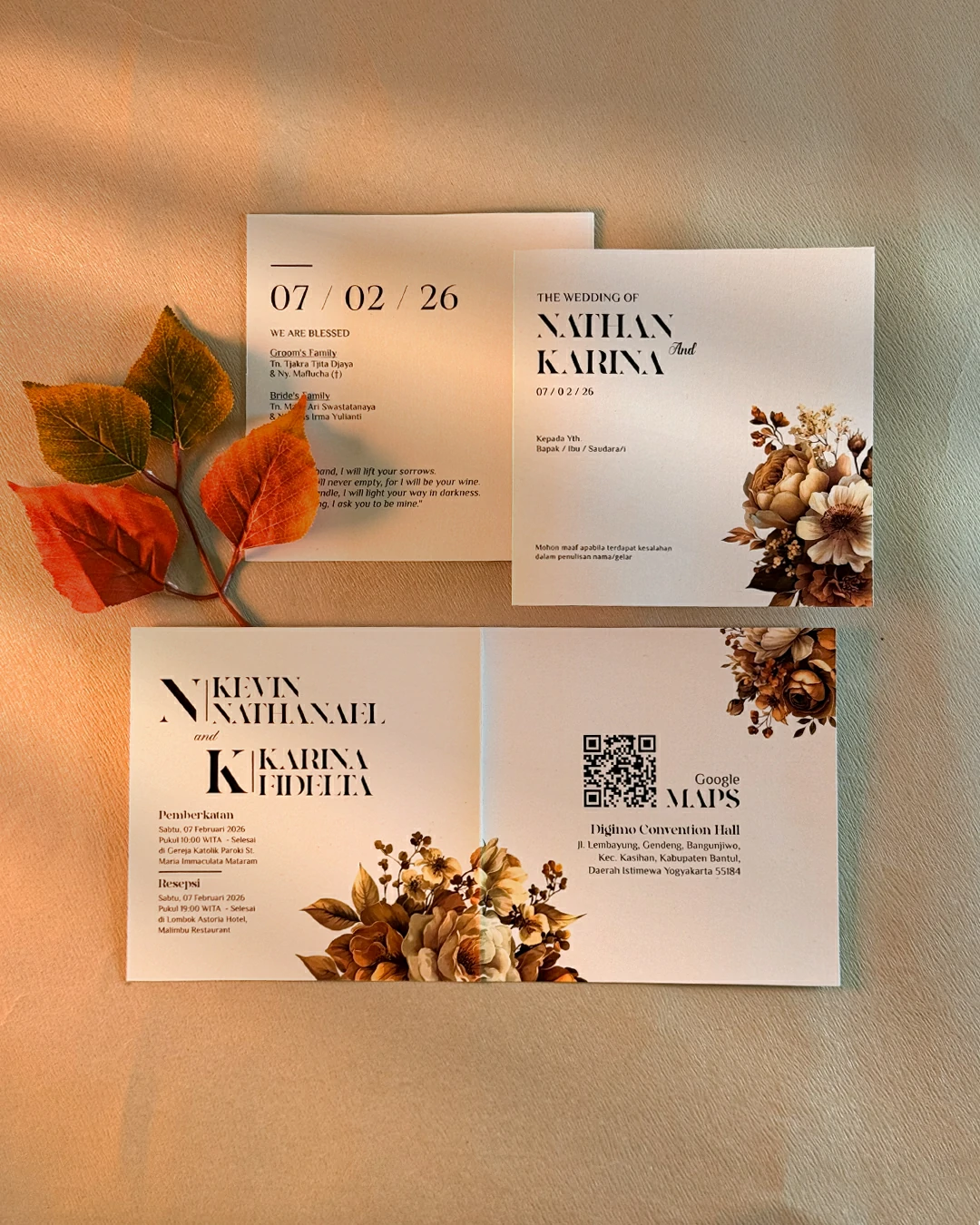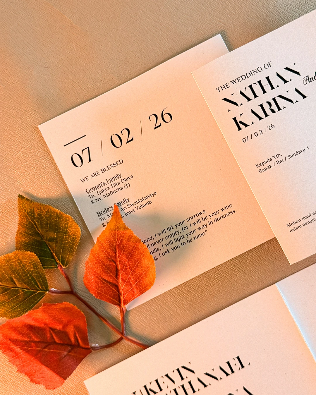 Amplop dirancang dengan warna senada untuk menciptakan kesatuan visual yang harmonis, cocok untuk konsep pernikahan minimalis, rustic, klasik modern, hingga garden wedding. Detail kecil seperti lipatan presisi dan permukaan kertas yang halus menjadikan undangan terasa rapi dan berkelas saat dipegang.