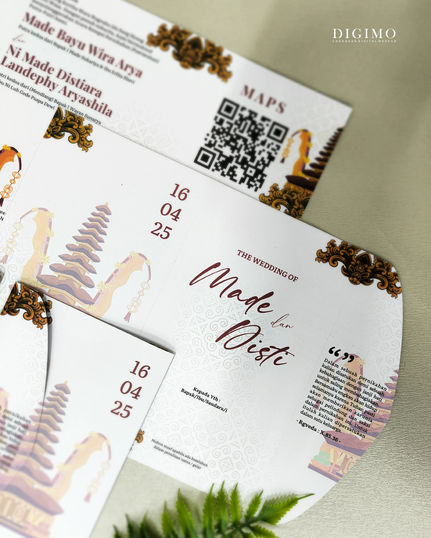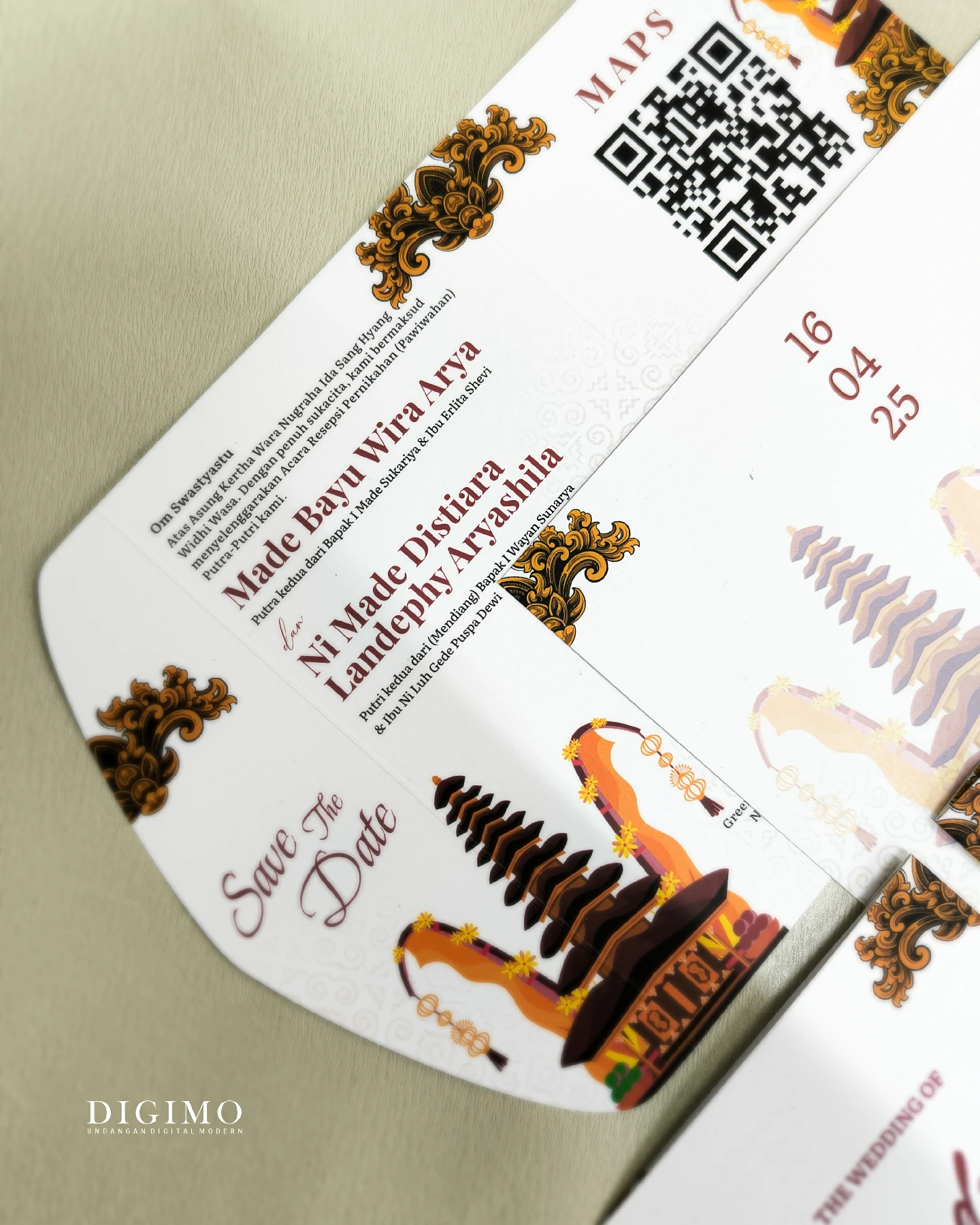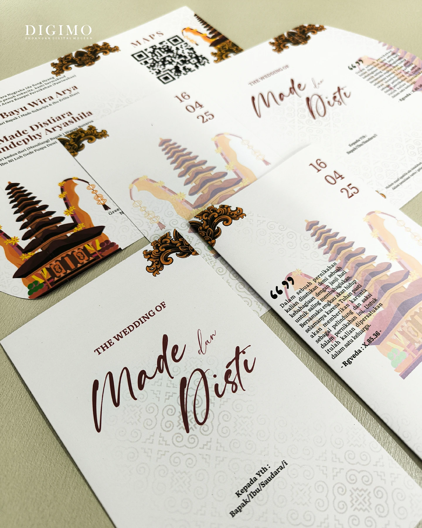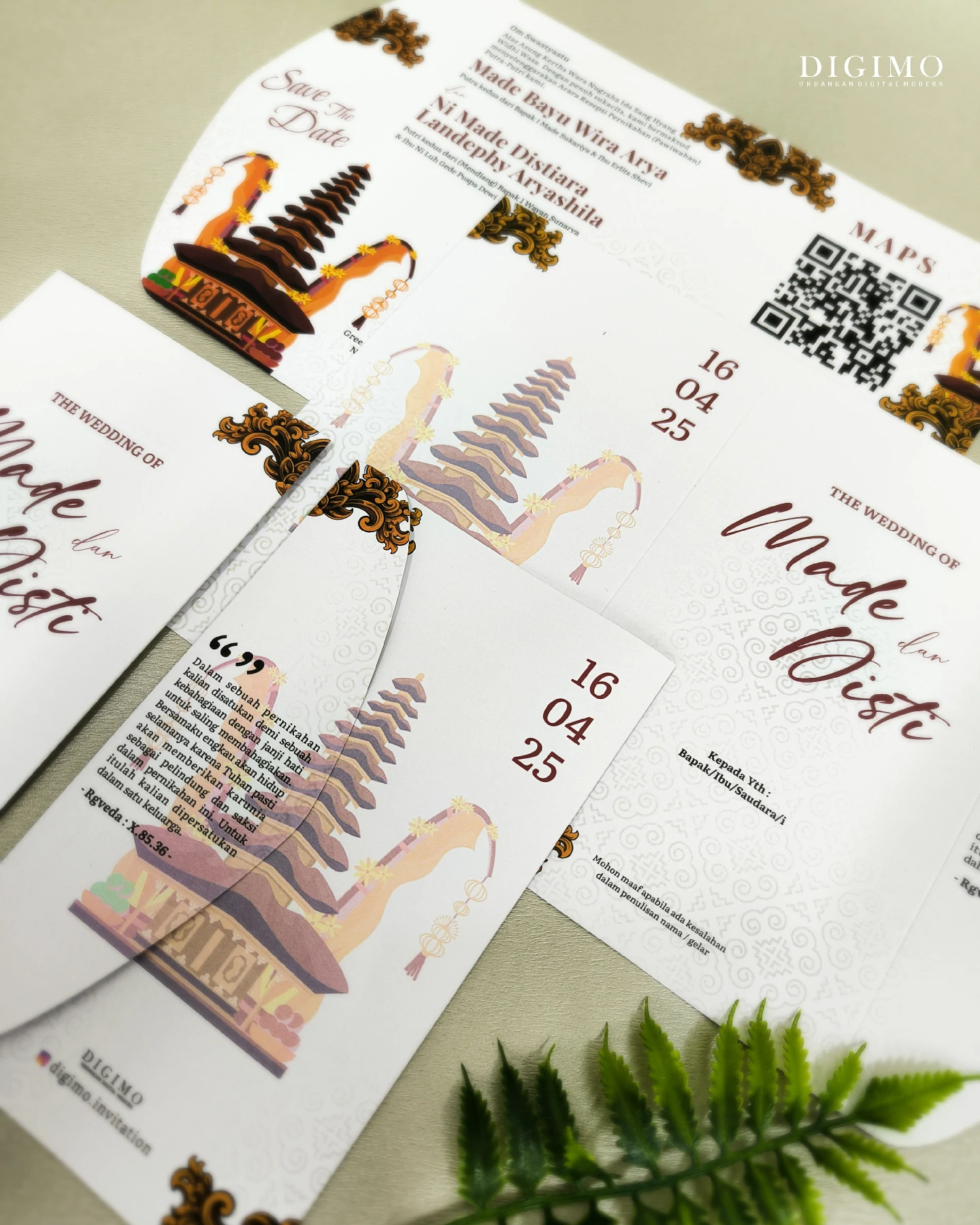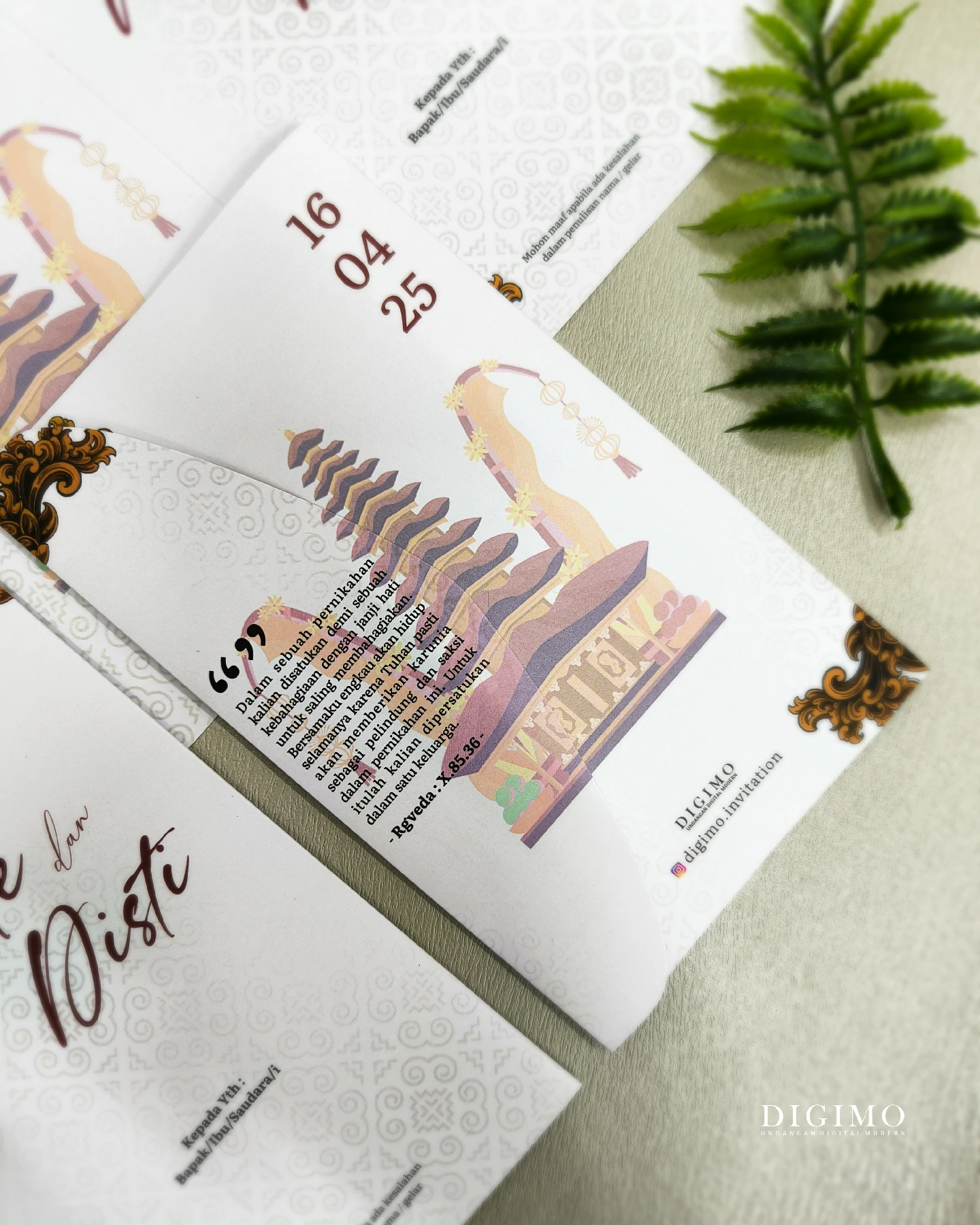 Amplop dirancang dengan warna senada untuk menciptakan kesatuan visual yang harmonis, cocok untuk konsep pernikahan minimalis, rustic, klasik modern, hingga garden wedding. Detail kecil seperti lipatan presisi dan permukaan kertas yang halus menjadikan undangan terasa rapi dan berkelas saat dipegang.