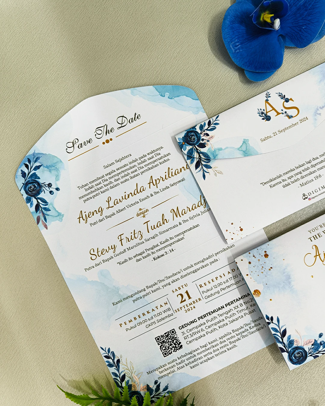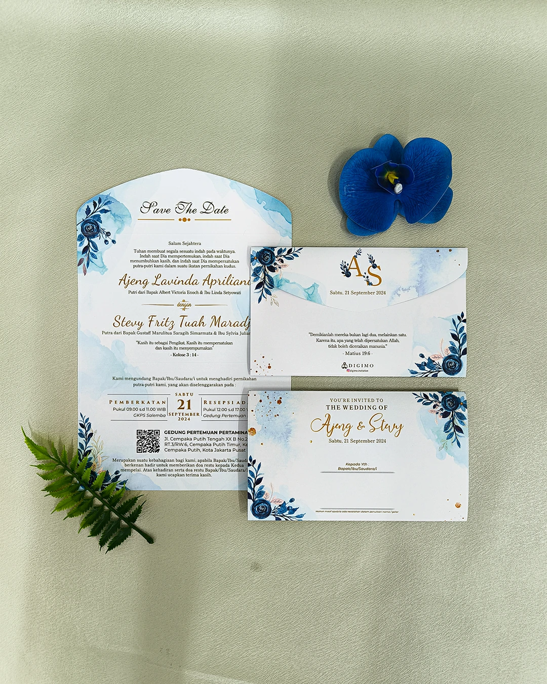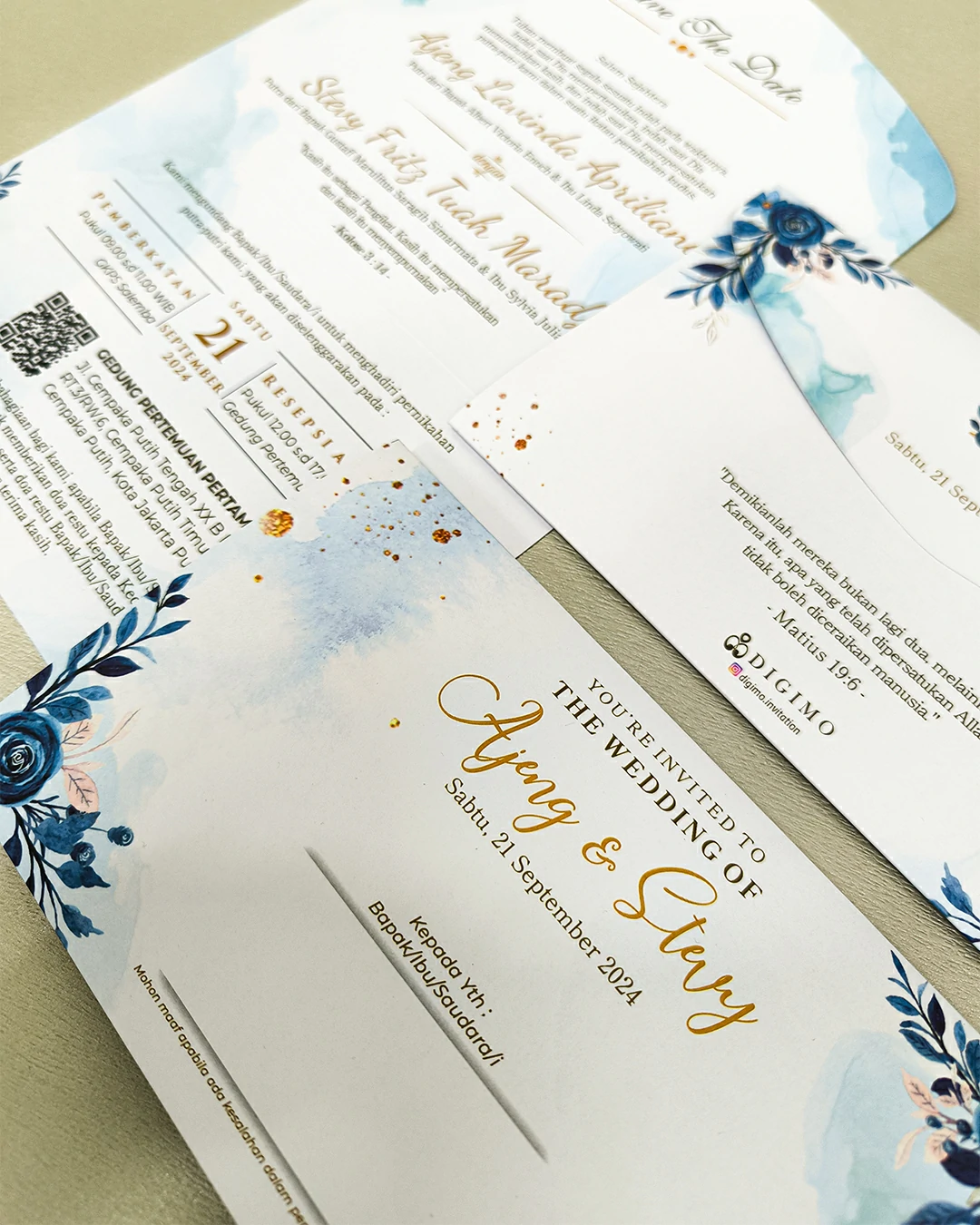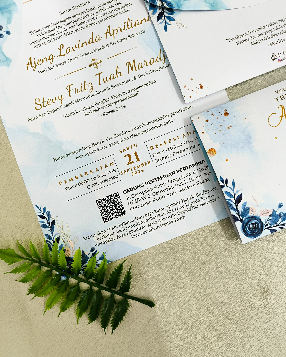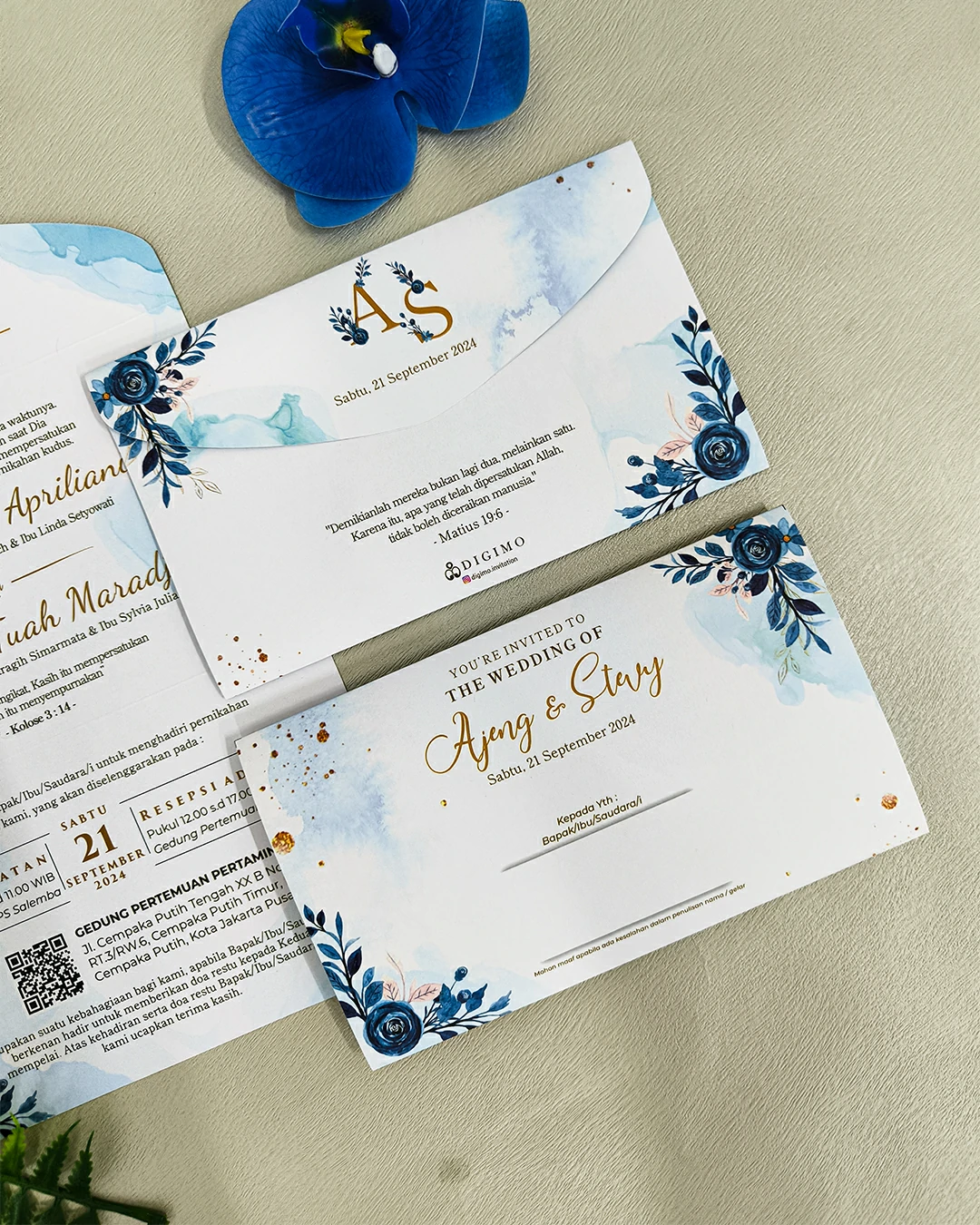 Amplop dirancang dengan warna senada untuk menciptakan kesatuan visual yang harmonis, cocok untuk konsep pernikahan minimalis, rustic, klasik modern, hingga garden wedding. Detail kecil seperti lipatan presisi dan permukaan kertas yang halus menjadikan undangan terasa rapi dan berkelas saat dipegang.