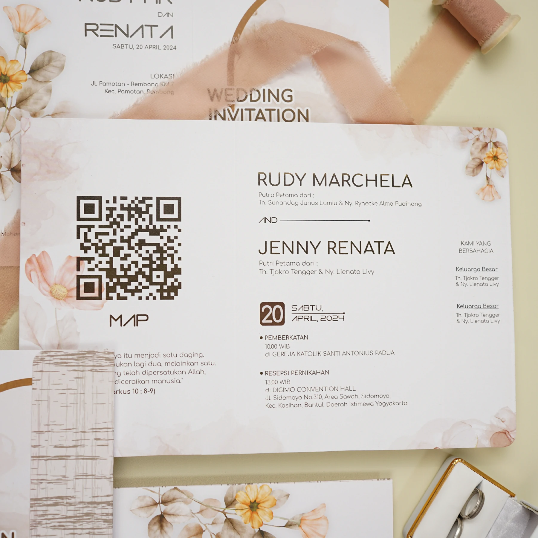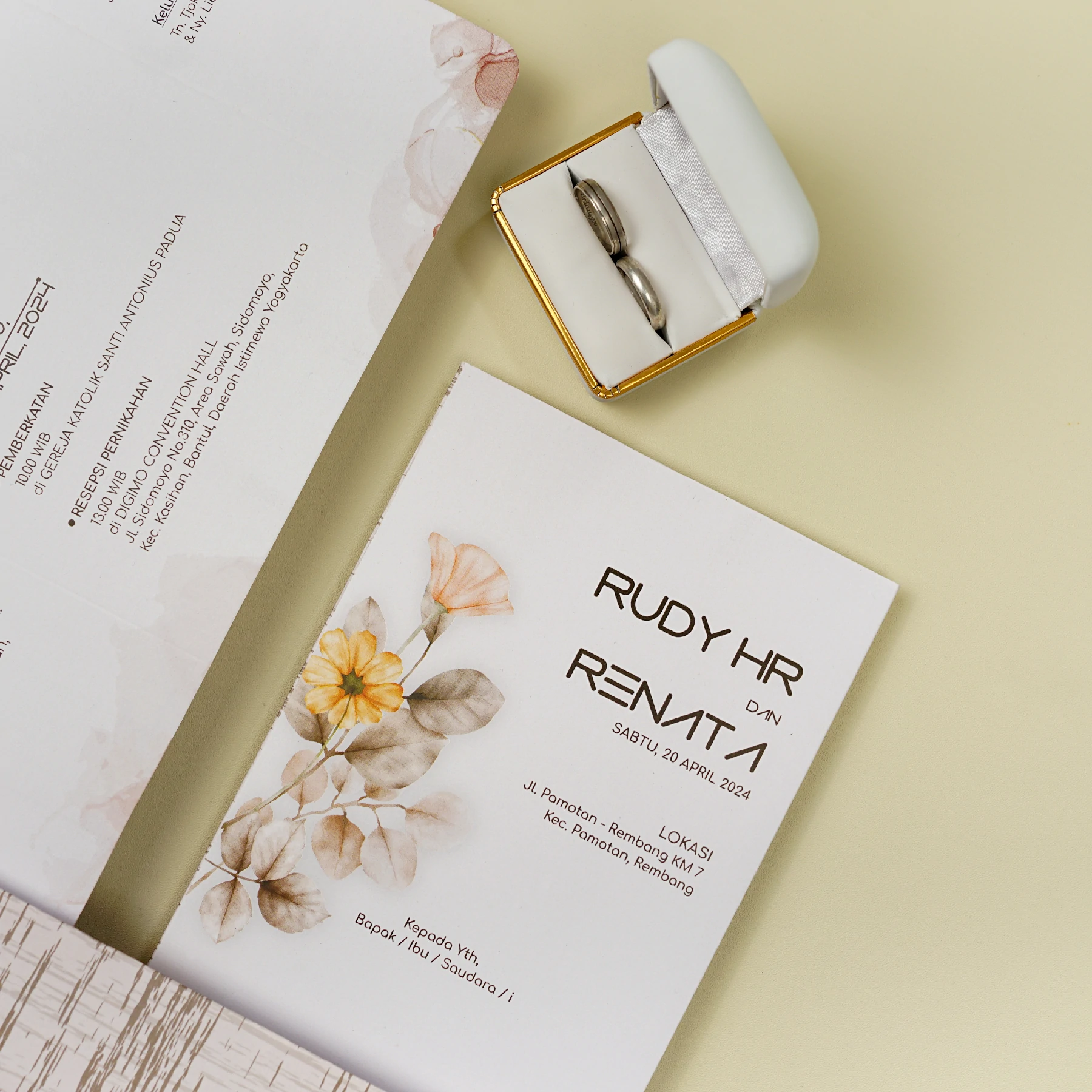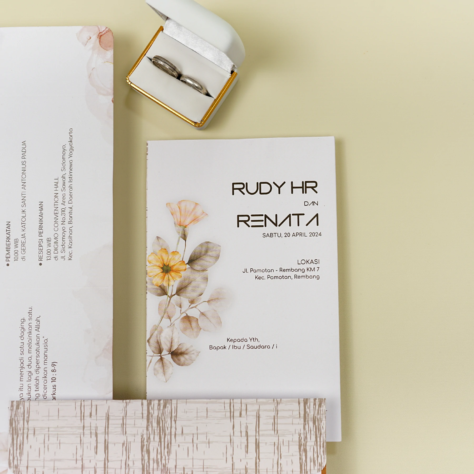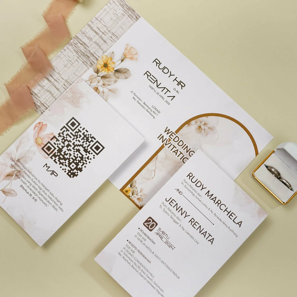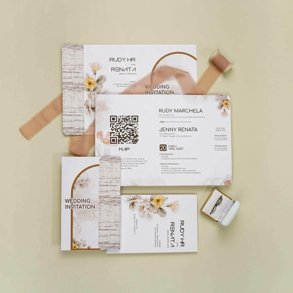 Amplop dirancang dengan warna senada untuk menciptakan kesatuan visual yang harmonis, cocok untuk konsep pernikahan minimalis, rustic, klasik modern, hingga garden wedding. Detail kecil seperti lipatan presisi dan permukaan kertas yang halus menjadikan undangan terasa rapi dan berkelas saat dipegang.