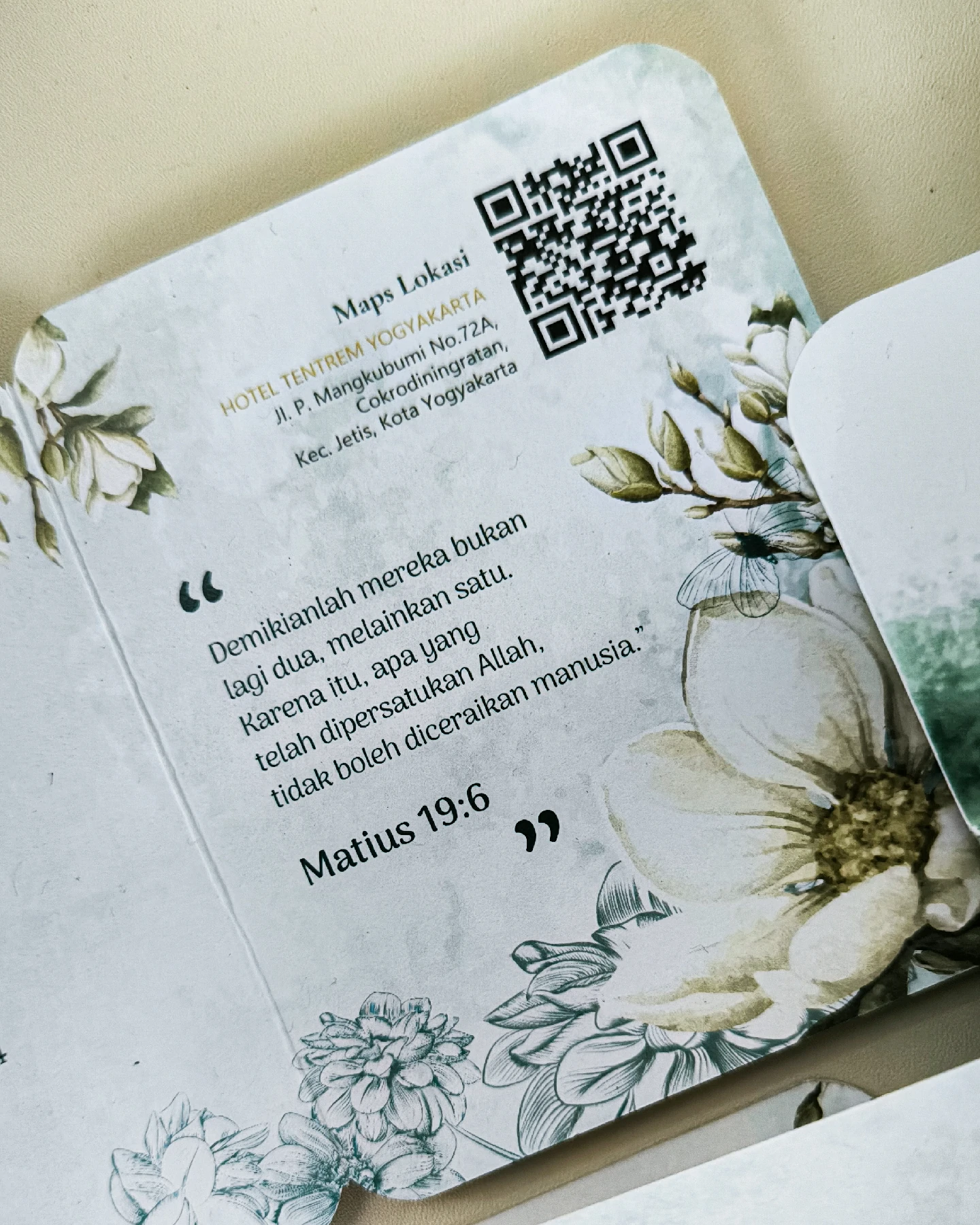 Amplop dirancang dengan warna senada untuk menciptakan kesatuan visual yang harmonis, cocok untuk konsep pernikahan minimalis, rustic, klasik modern, hingga garden wedding. Detail kecil seperti lipatan presisi dan permukaan kertas yang halus menjadikan undangan terasa rapi dan berkelas saat dipegang.