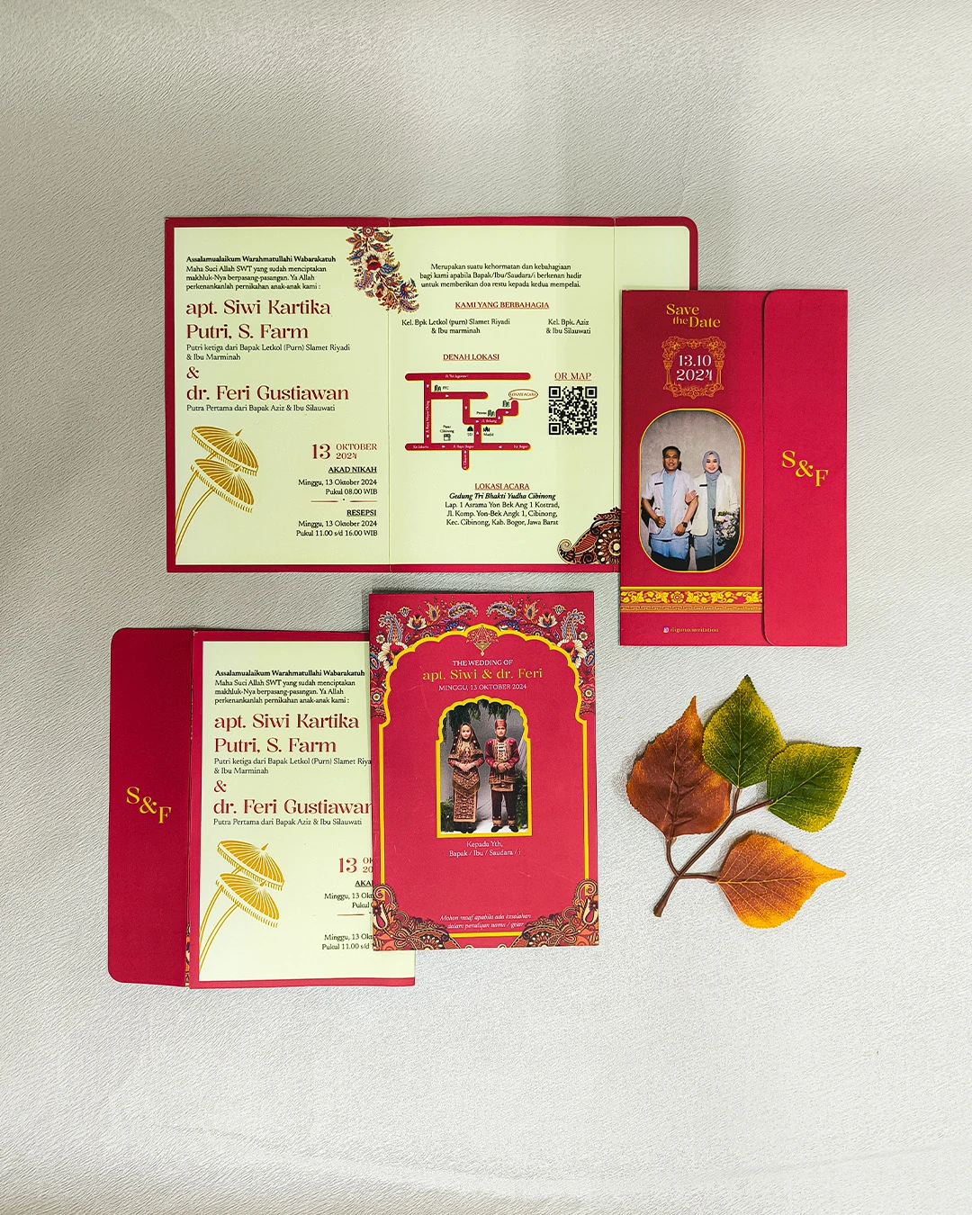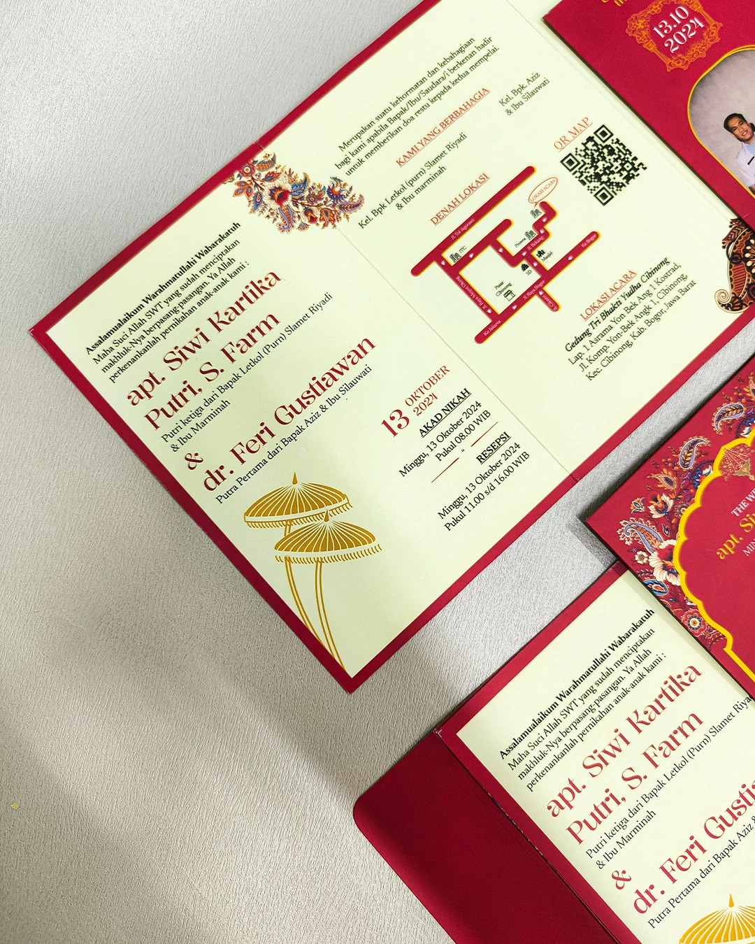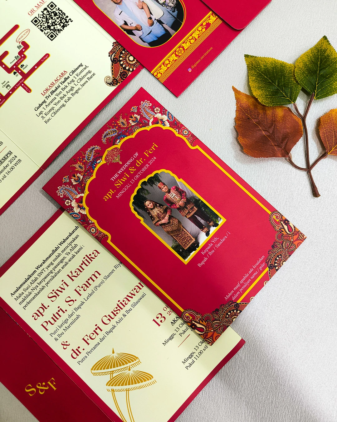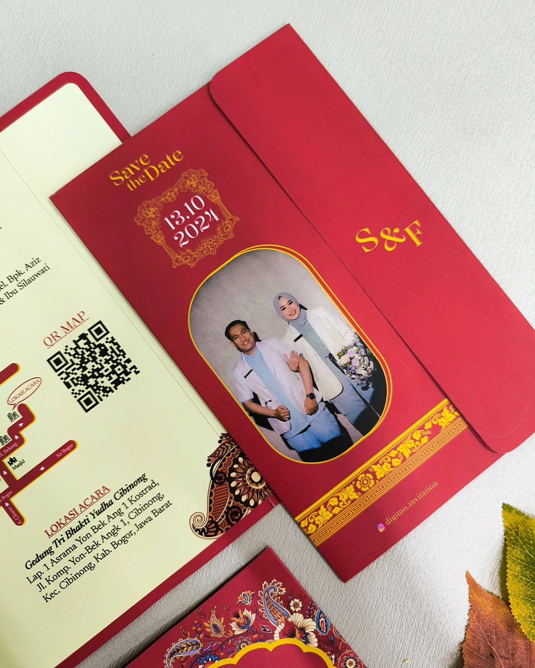Amplop dirancang dengan warna senada untuk menciptakan kesatuan visual yang harmonis, cocok untuk konsep pernikahan minimalis, rustic, klasik modern, hingga garden wedding. Detail kecil seperti lipatan presisi dan permukaan kertas yang halus menjadikan undangan terasa rapi dan berkelas saat dipegang.